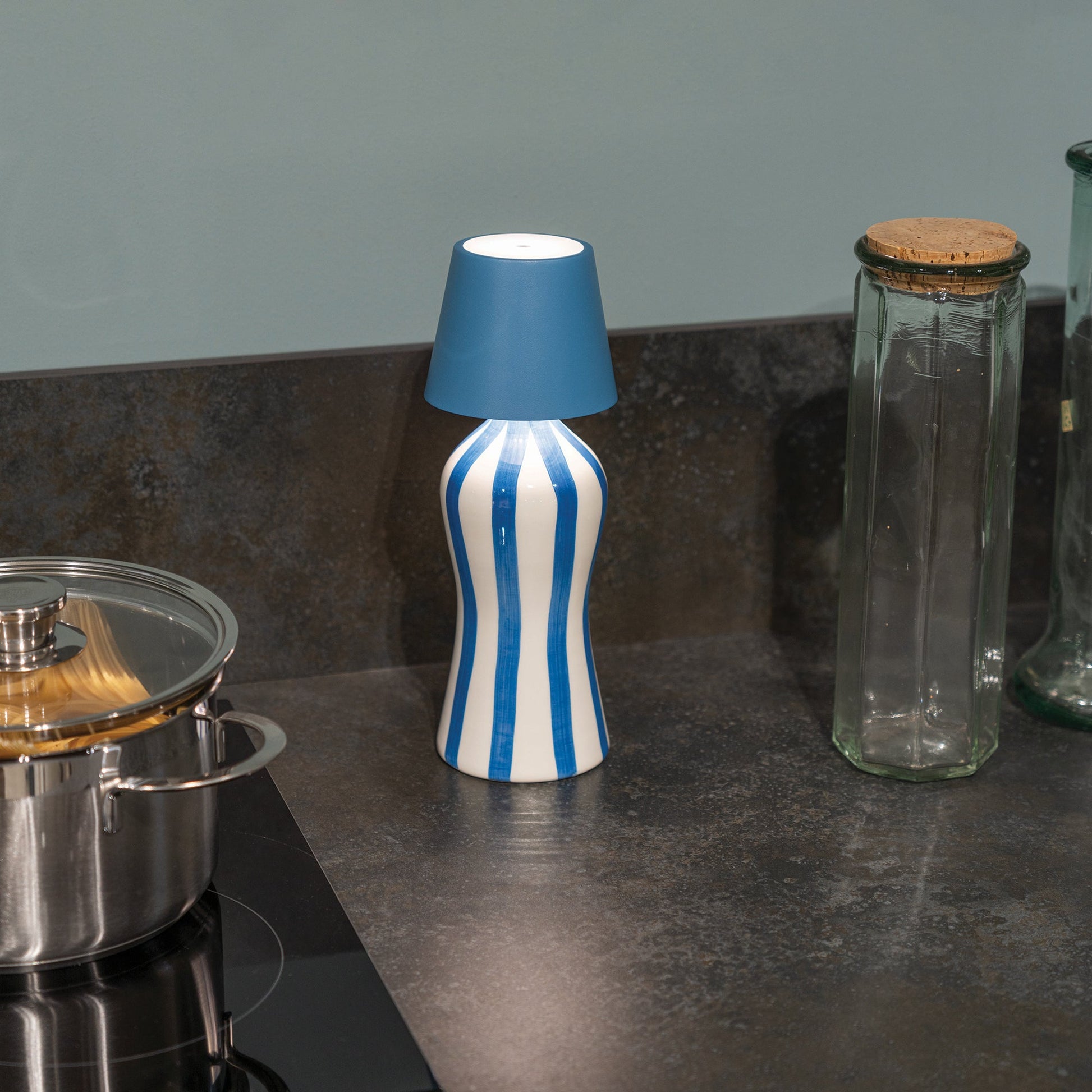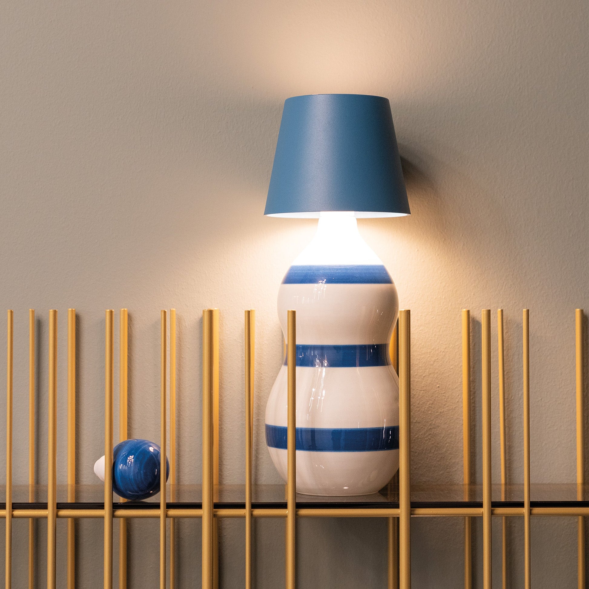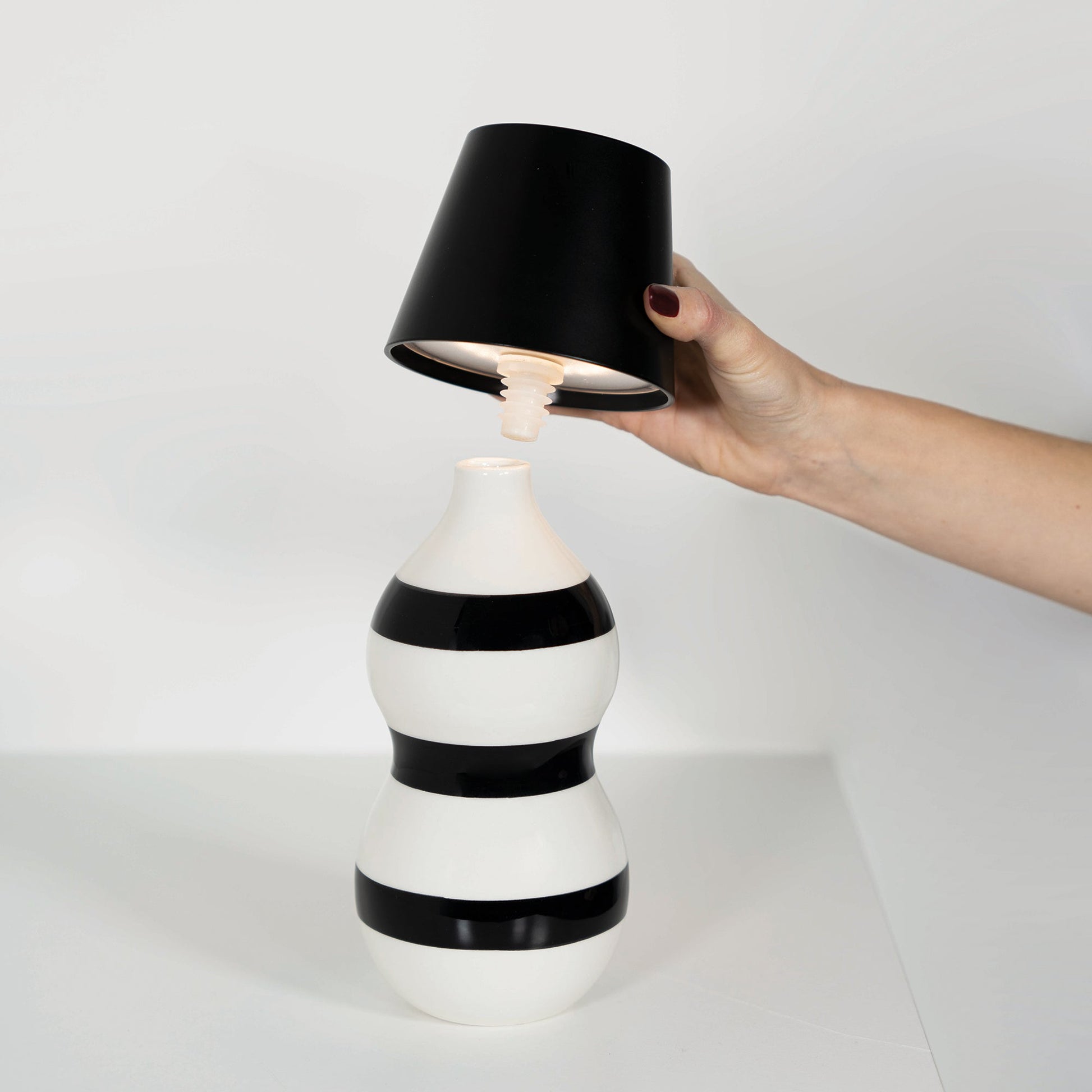Cordless, rechargeable, battery lamp with a silicone stopper that can be inserted into a bottle to create an original light. A touch control on the top of the lamp head allows you to switch the light on, adjust its intensity and select its color temperature.And thanks to its high IP rating, the lamp can also be used outdoors. An electronic control system monitors and indicates the remaining battery power to ensure recharging is optimized and always performed correctly. The silicone (food safe) stopper fits into different bottle necks and can be easily removed, allowing the lamp to be recharged easily on its contact charging base. The lamp comes with a contact charging base. Battery charger not included. The Poldina Stopper can also be used with "Lido" ceramic bottles that can be purchased separately.