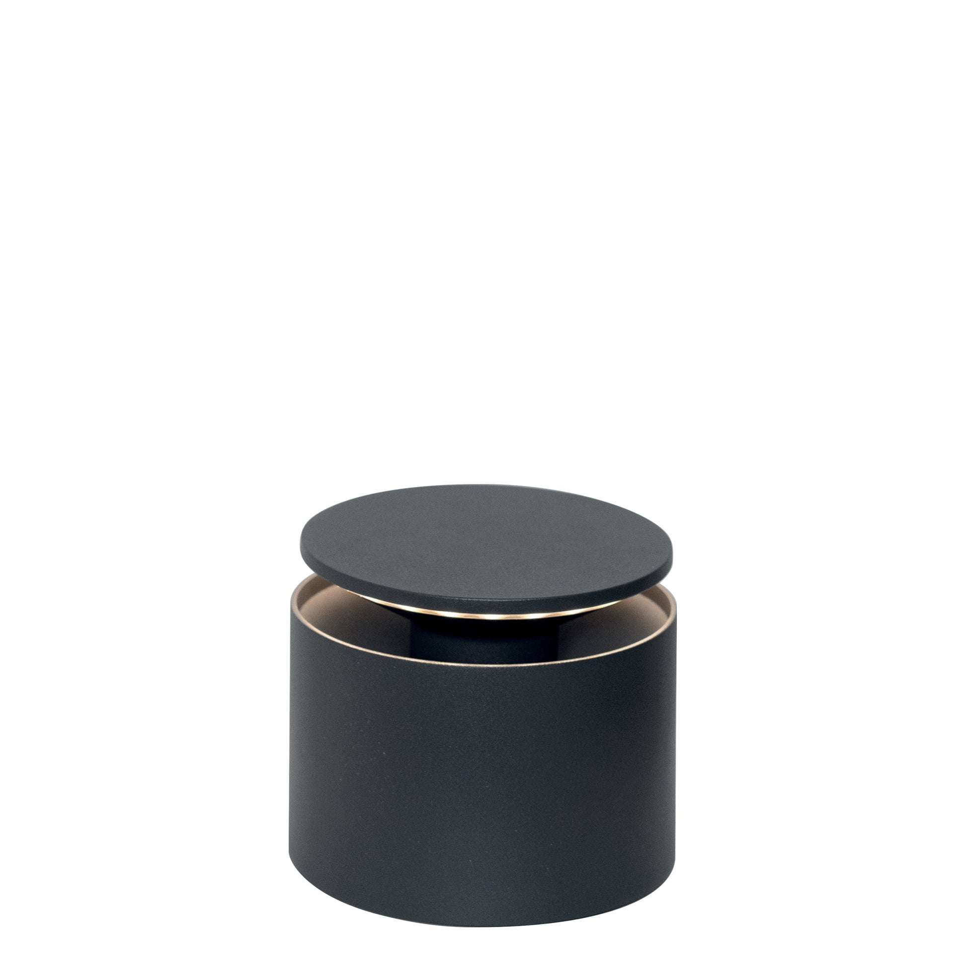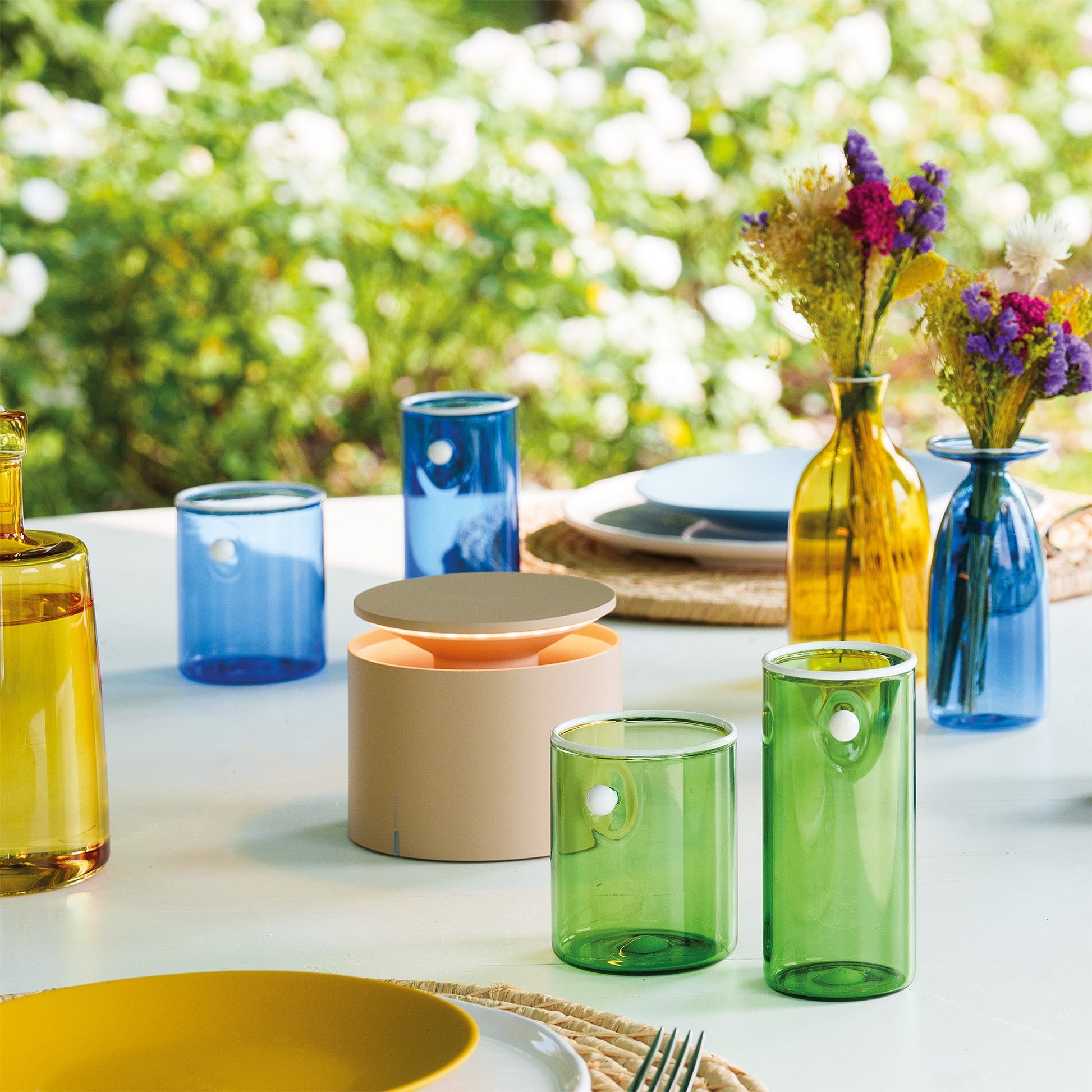 Cordless, rechargeable, battery table lamp. When you press on the top of the lamp, it lifts up and the light comes on. To turn it off, you simply need to press it down again. Under the base there is a touch control that when the top of the lamp is up, allows you to switch the light on, adjust its intensity and select its color temperature. And thanks to its high IP rating, the lamp can also be used outdoors. An electronic control system monitors and indicates the remaining battery power to ensure recharging is optimized and always performed correctly. The lamp comes with a contact charging base. Battery charger not included.