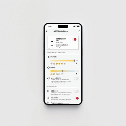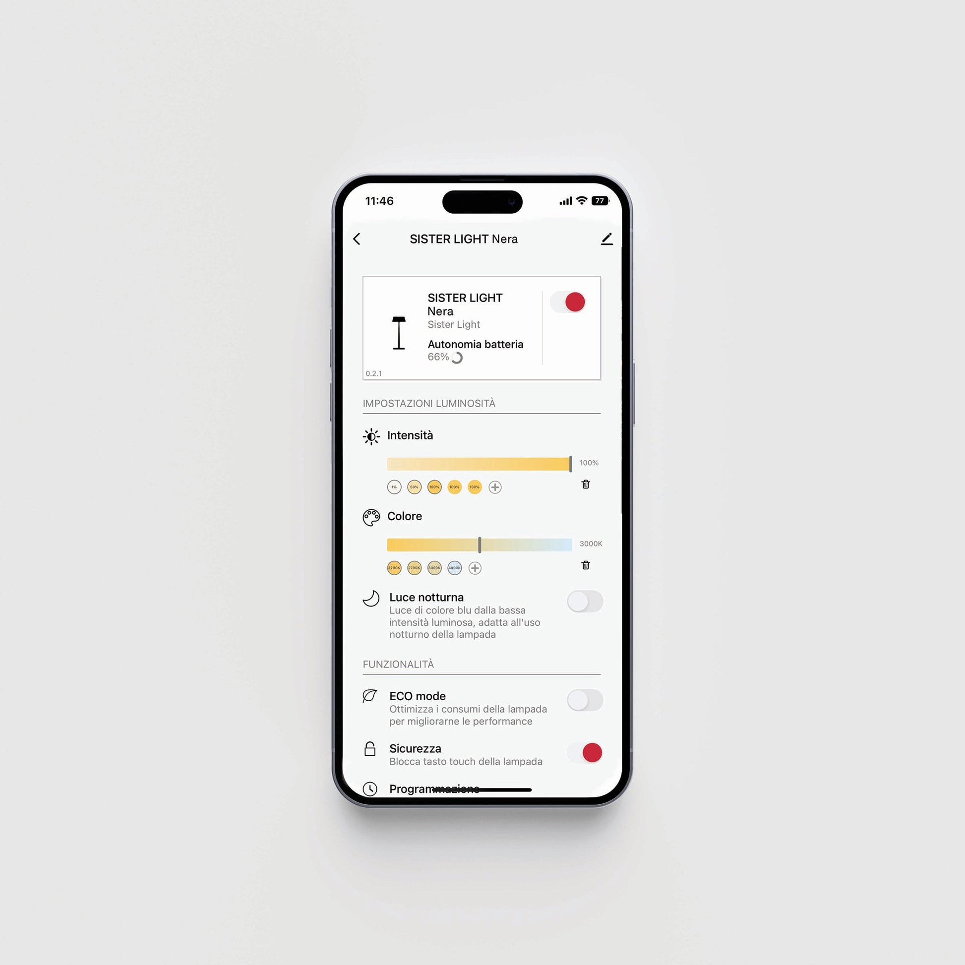 Cordless, rechargeable, battery table lamp; this can be remote controlled using the Zafferano Lighting app. A touch control on the top of the lamp head allows you to switch the light on, dim it in 4 steps and select its color temperature. And thanks to its high IP rating, the lamp can be used outdoors and is also salt spray resistant (1500 h). An electronic control system monitors the remaining battery power and guarantees a constant luminous flux until the battery runs out, ensuring that recharging is optimized and always performed correctly. It can be recharged by placing the lamp or unscrewed head on the contact charging base, included. Battery charger not included.